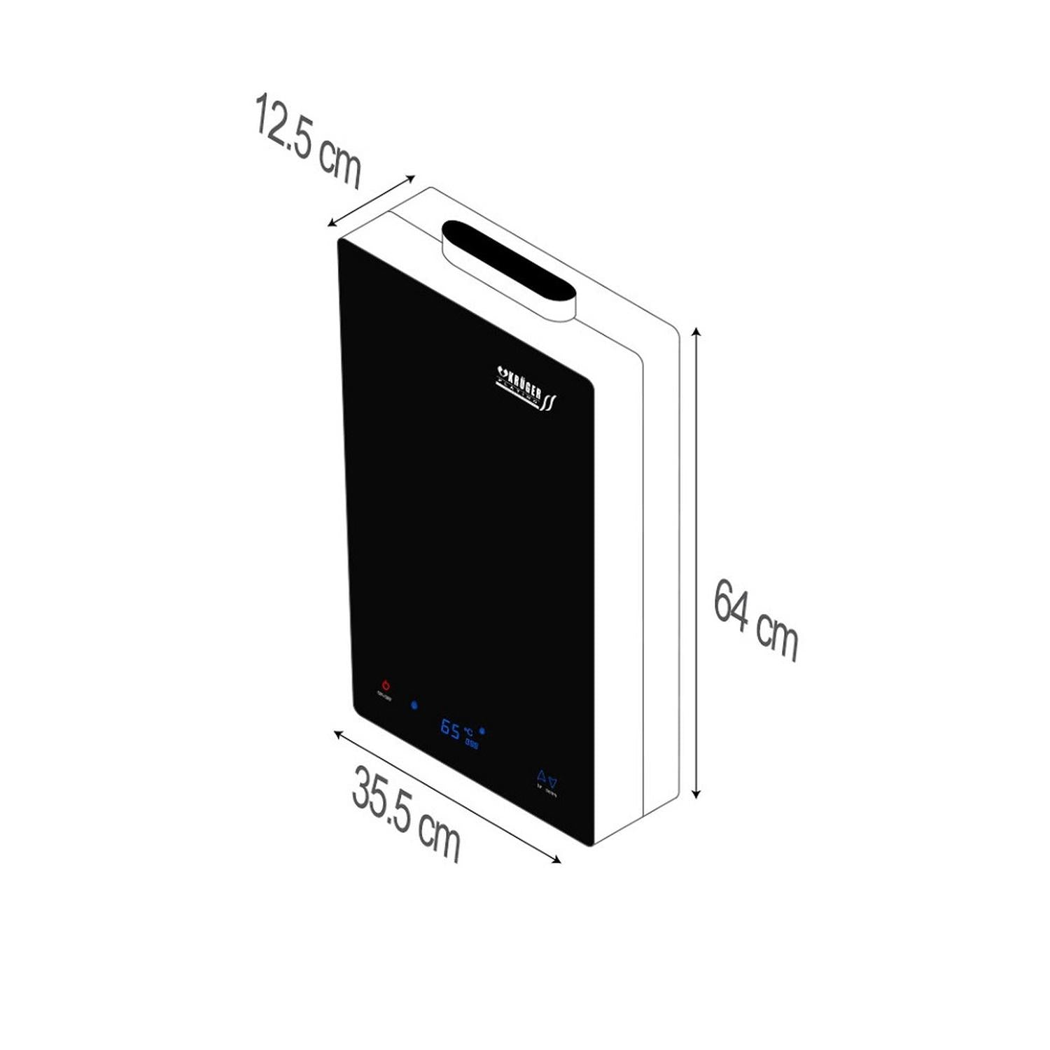 Calentador instantáneo de agua a Gas Natural, modulante con encendido electrónico (110 v). Flujo de agua de 12 lts/min a nivel del mar. Ahorra hasta un 80% en el consumo del Gas. Color negro con cubierta de cristal. Algunos de sus beneficios: sistema inteligente de temperatura constante, regulación automática de flujo de gas, amplia gama para el ajuste de la temperatura de 35 a 65 grados, baja presión de arranque, función de temporizador seleccionable, intercambiador de calor de cobre, pantalla LED que indica el flujo de agua de entrada, protección múltiple de seguridad: extinción, sobre presión de agua y sobrecalentamiento. También, cuenta con un candado de seguridad de temperatura para niños.