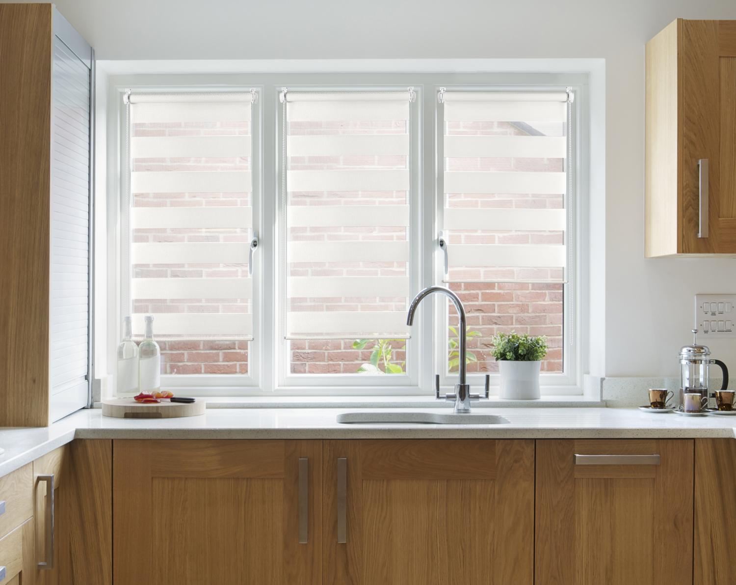 Persiana enrollable de doble franja, tejido de franjas transparentes y traslúcidas, accionamiento mediante cadeneta y soportes para instalación a techo o pared. Incluye también sistema de fijación "easyfix" opción que permite instalar la persiana sin herramientas y sin agujerear el marco de la ventana. Además incluye un sistema opcional de bloqueo inferior anti-wind que evita que la persiana se mueva y golpee contra la ventana. Incluye sistema de seguridad infantil. Esta persiana con estética sobria y moderna impide la visión del exterior y aporta total privacidad. Puede sustituir la persiana exterior ya que su tejido no deja pasar la luz. Como ocupa poco espacio también puede colocarse de forma discreta detrás de la cortina. Es ideal para dormitorios y estancias donde se busque una solución fácil al cubrimiento completo y opaco de la ventana.